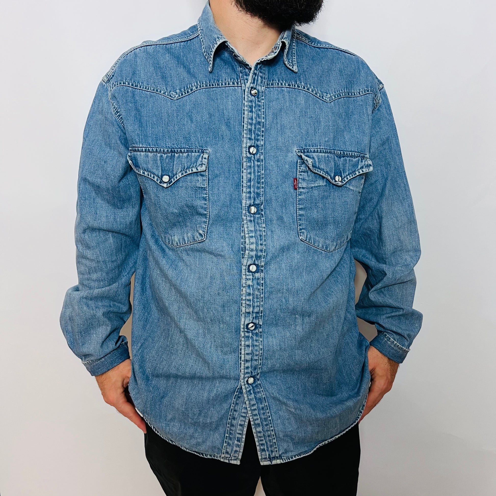Das Levis Vintage 90s Barstow Western Jeanshemd in Blau und Größe XL ist ein seltenes, begehrtes Sammlerstück. Mit seinem klassischen Western-Design vereint es zeitlose Coolness und robuste Qualität – perfekt für Liebhaber authentischer Vintage-Mode.